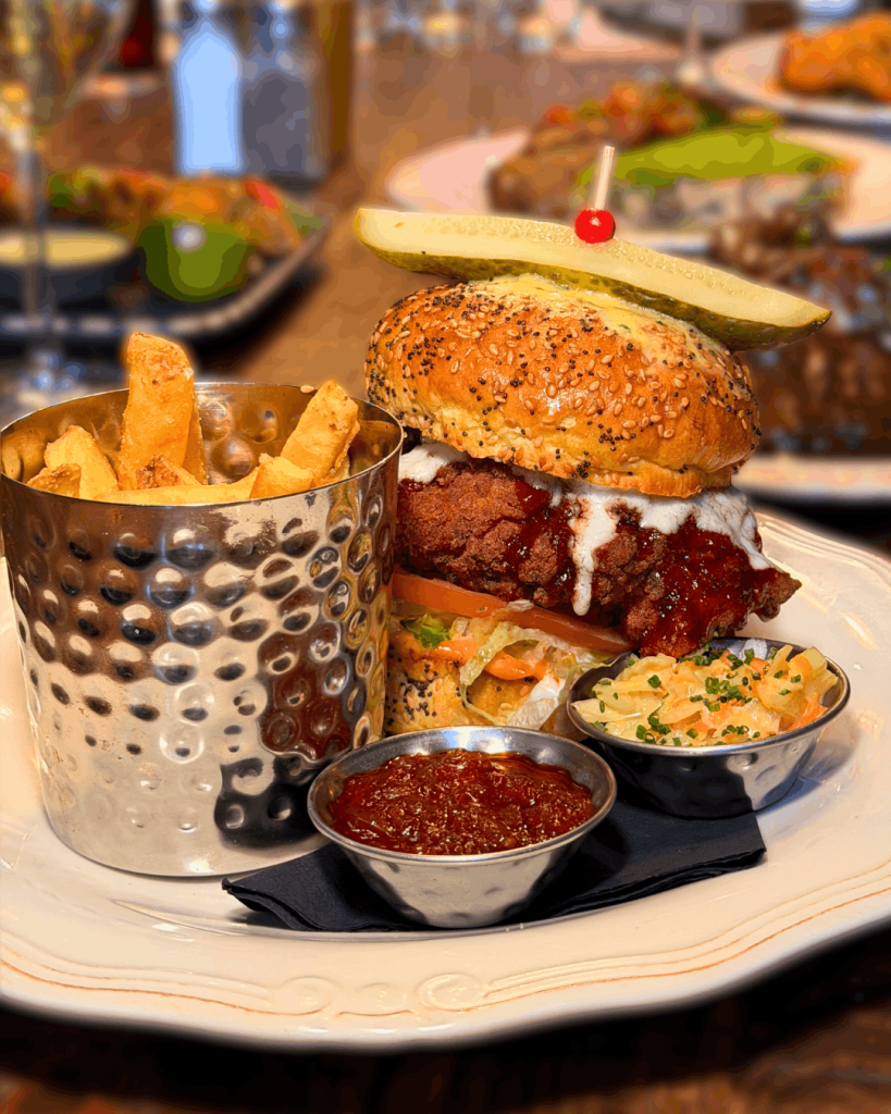 Crispy buttermilk fried chicken, smoky paprika aioli and harissa hot honey come together in a seeded brioche bun with whipped feta and fresh greens. Bold, juicy, and impossible to resist.